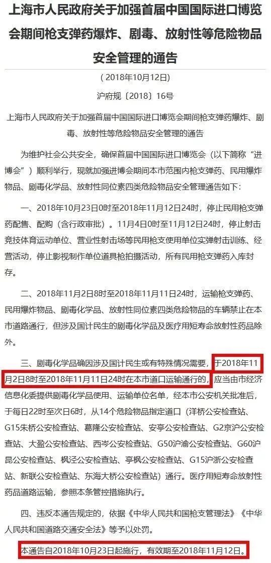 根据上海市各级政府的要求和布署,进口博览会期间,道路危险化学品运输车辆自11月2日至11月12日禁止营运。
