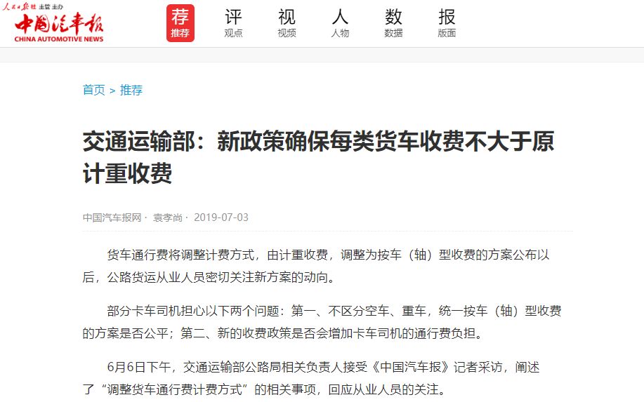 交通运输部相关负责人表示:不区分重车、空车,统一按车(轴)型收费是科学的、合理的,是国际上的普遍做法,客观上也能激励司机在收费公路满载运输,以降低空驶率,节约物流运输成本。
