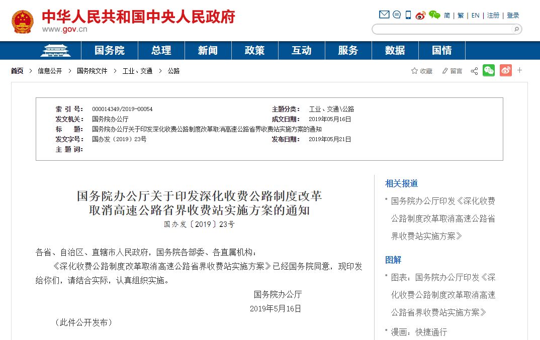 2019年5月16日,国务院办公厅印发了《深化收费公路制度改革取消高速公路省界收费站实施方案》(国办发〔2019〕23号)。