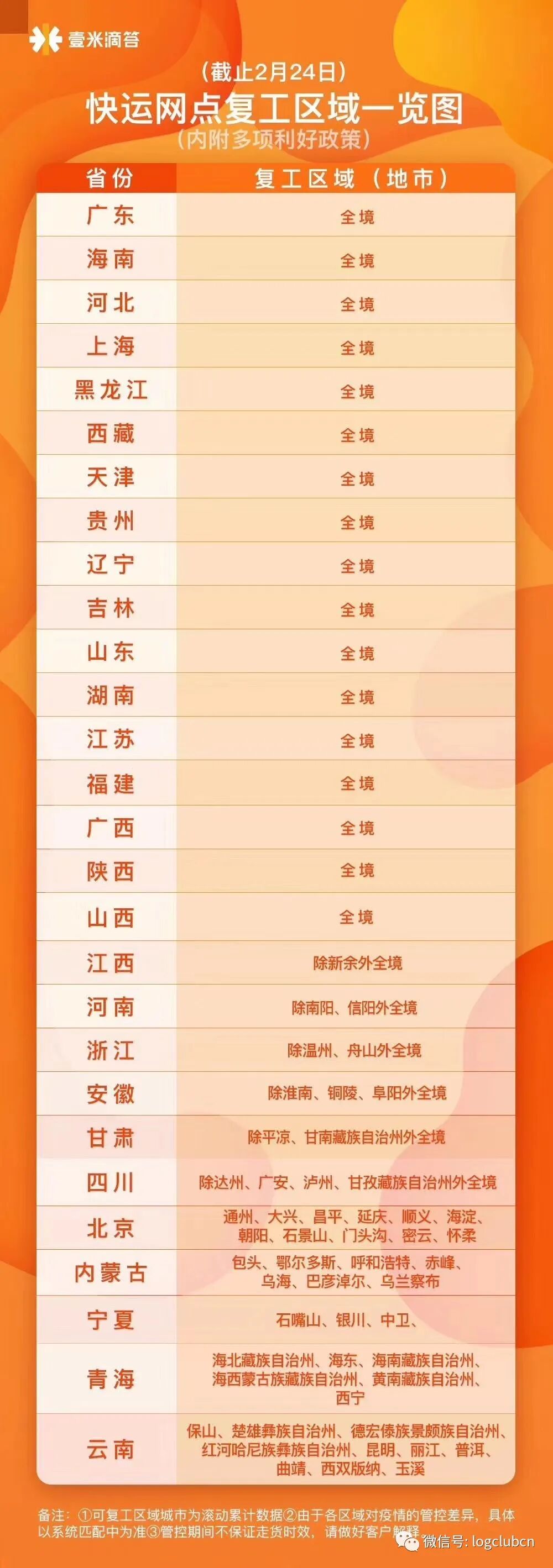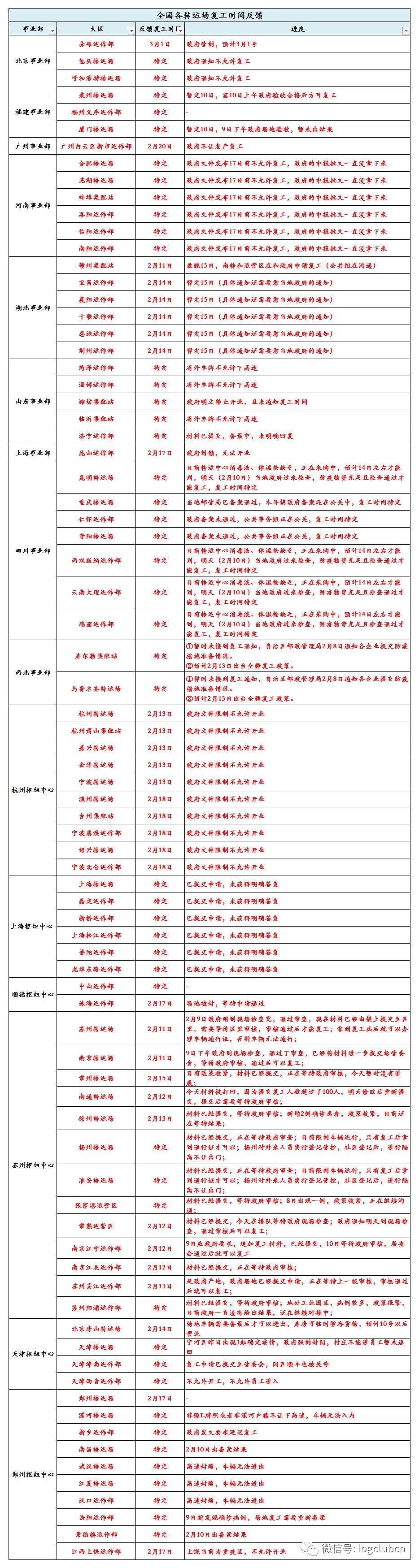 (某一线快运公司全国各转运场的复工情况)