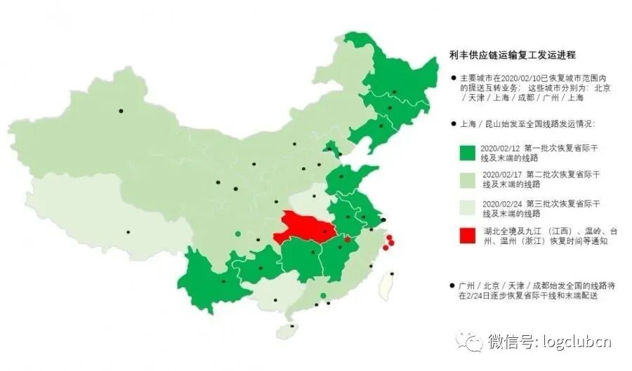 物流企业发运也采取了阶段性复工的方式,以利丰供应链为例,其B2B业务恢复运输的主要线路省份及服务范围恢复为:北京、天津、上海、成都、广州这样的主要城市在2月10日已恢复城市范围内的提送互转业务。上海/昆山始发至全国线路发运,省际干线及末端的线路第一批次恢复为2月12日、第二批次为2月17日、第三批次为2月24日。湖北全境及九江、温岭、台州、温州恢复时间等通知。广州、北京、天津、成都始发全国的线路将在2月24日逐步恢复省际干线和末端配送。