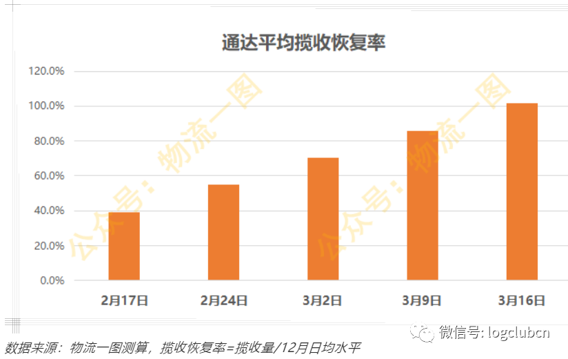 据物流一图统计,截至2月23日,通达揽收量基本都恢复到了去年12月日均的5成左右,顺丰更是超过了平常水平。据推测,按目前的恢复速度线性推算,本月底通达系揽收量预计可达到去年12月日均的7成,3月中旬揽收量基本可以恢复到100%。