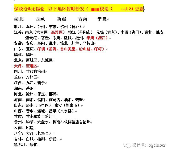 (某一线快运公司的停发地区)