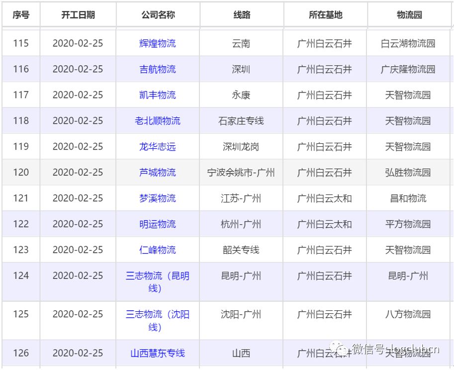 据罗戈网·物流沙龙观察,物流行业呈现阶段性复工特点。2月5日,国内最大的物流集聚区之一——广州市白云区发布了第一批复工名单(所属街镇:太和),第一批名单里的企业是10号前申请的复工,检验合格2月10号0时起就可以正常经营。最近白云区又公布了专线开工时间,三百多家企业中,2月17~23日开工的有103家,2月25日~3月2日开工的有229家。