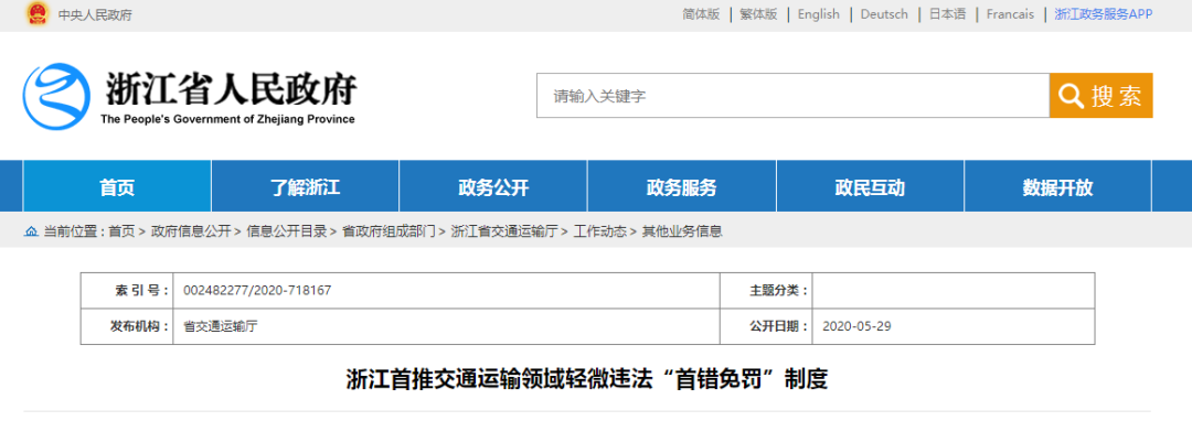近日,浙江省交通运输厅、省综合行政执法指导办公室联合印发《关于在交通运输领域推行轻微违法行为告知承诺制的意见(试行)》(以下简称《意见》),在全国首推交通运输轻微违法行为“首错免罚”制度。本意见自2020年7月1日起施行。